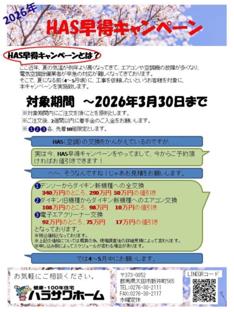 2026年1月23日 / 最終更新日 : 2026年1月23日 TsuchiyaKiyonobu お知らせ ご好評につき再度!!HAS早得キャンペーンを実施致します。 HASの故障や不調でお悩みのお客様へキャンペーンのお知らせです。 本キャンペーン期間中(2026.3.30迄)に工事をご注文頂いたお客様へ特別価格にて、ご提供致します。 ご興味のある方は是非、ハラサワホームへお問い合わせください。 FacebookXBluesky